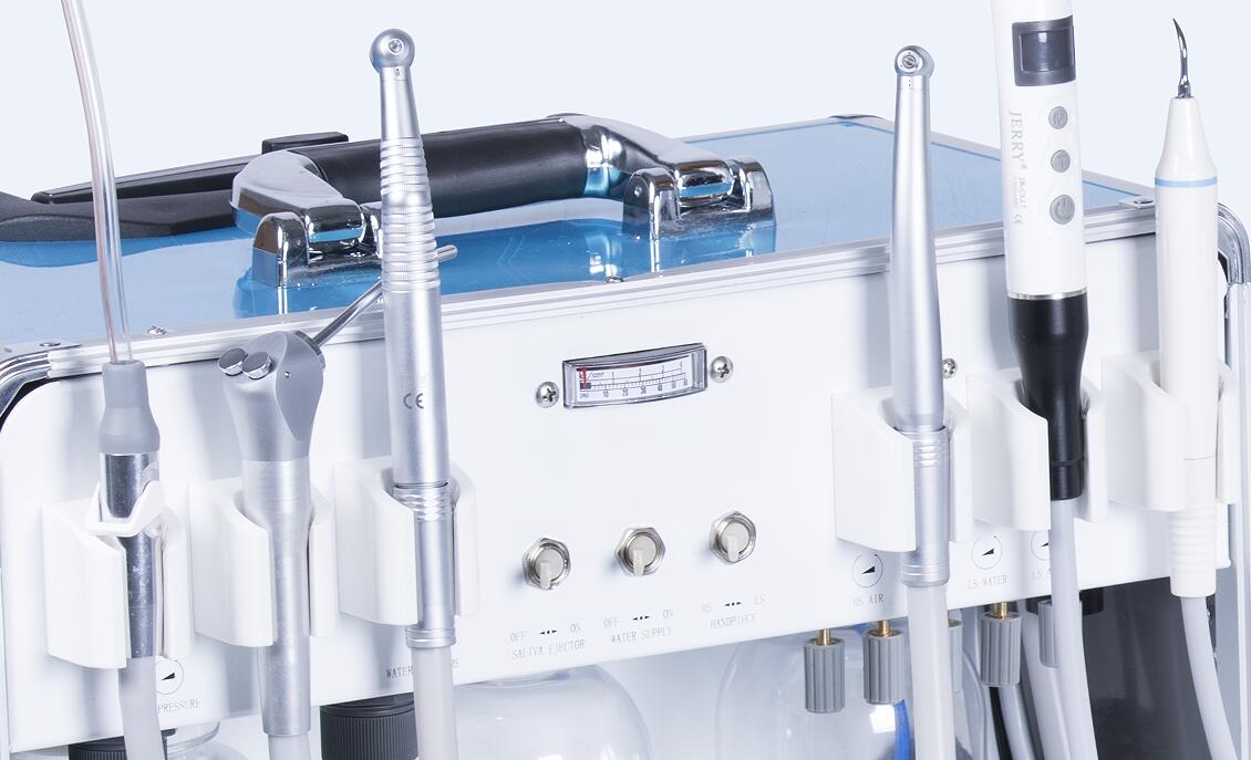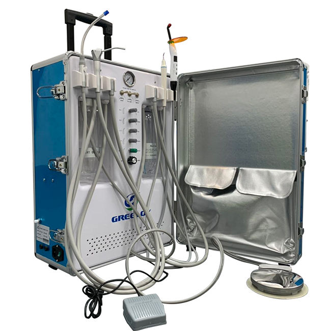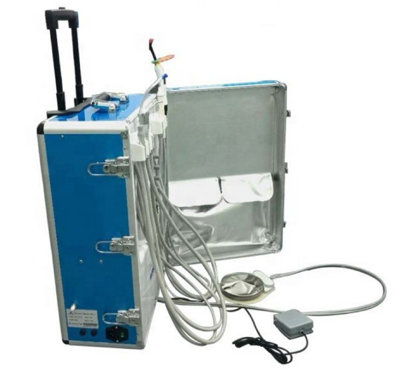 Multi-functional dental unit in small size and portable design, contains same functions as traditional dental chair, and with built-in oil free compressor. It is qualified with a fashionable appearance, aluminum alloy case or ABS case as option, light in weight but durable in quality. All instruments are packed in a small case, with space for storage. It is convenient to carry out for outdoor dental treatment.