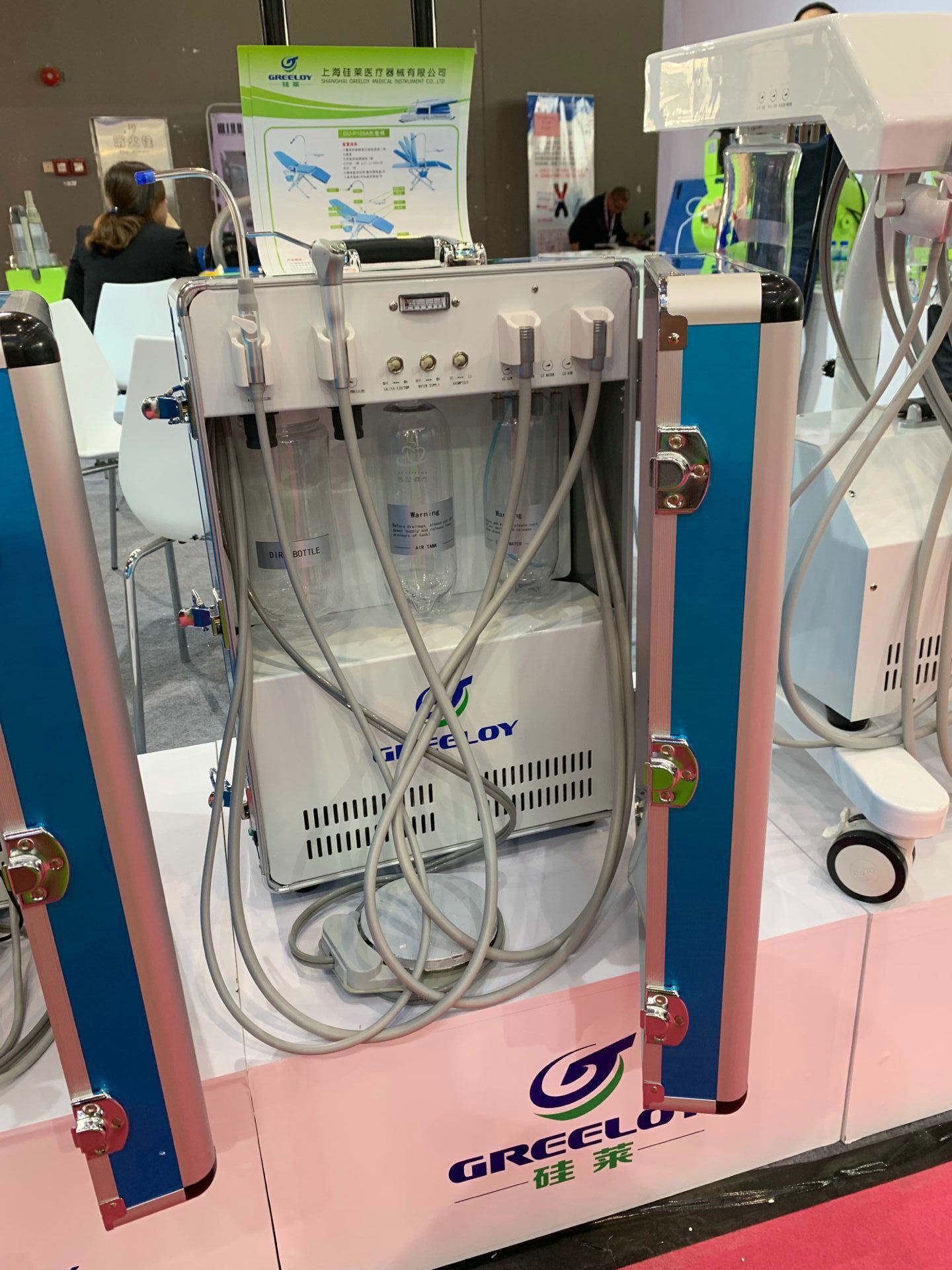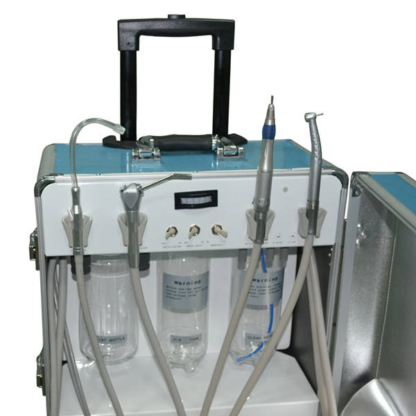 Multi-functional dental unit in small size and portable design, contains same functions as traditional dental chair, and with built-in oil free compressor. It is qualified with a fashionable appearance, aluminum alloy case or ABS case as option, light in weight but durable in quality. All instruments are packed in a small case, with space for storage. It is convenient to carry out for outdoor dental treatment.