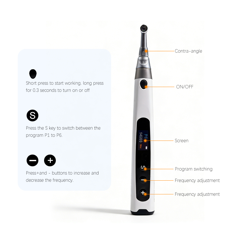 4. Plug-and-Play Desigh & Sterilizable: 1:1 contra angle is detachable and sterilizable, ensuring hygiene and safety in clinical environments.
