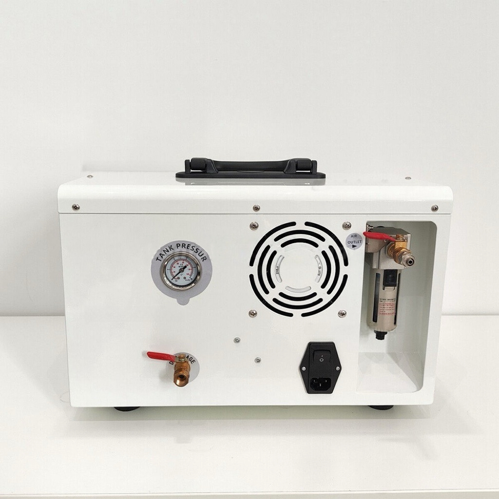 The portable compressor GA-P 300, it is silent, oil free motor, metal cabinet with handle for free movement, with built-in stainless steel tank, also air flow outlet with pre-filter & cooling system, which would keep clean air flow supply.