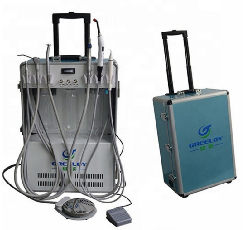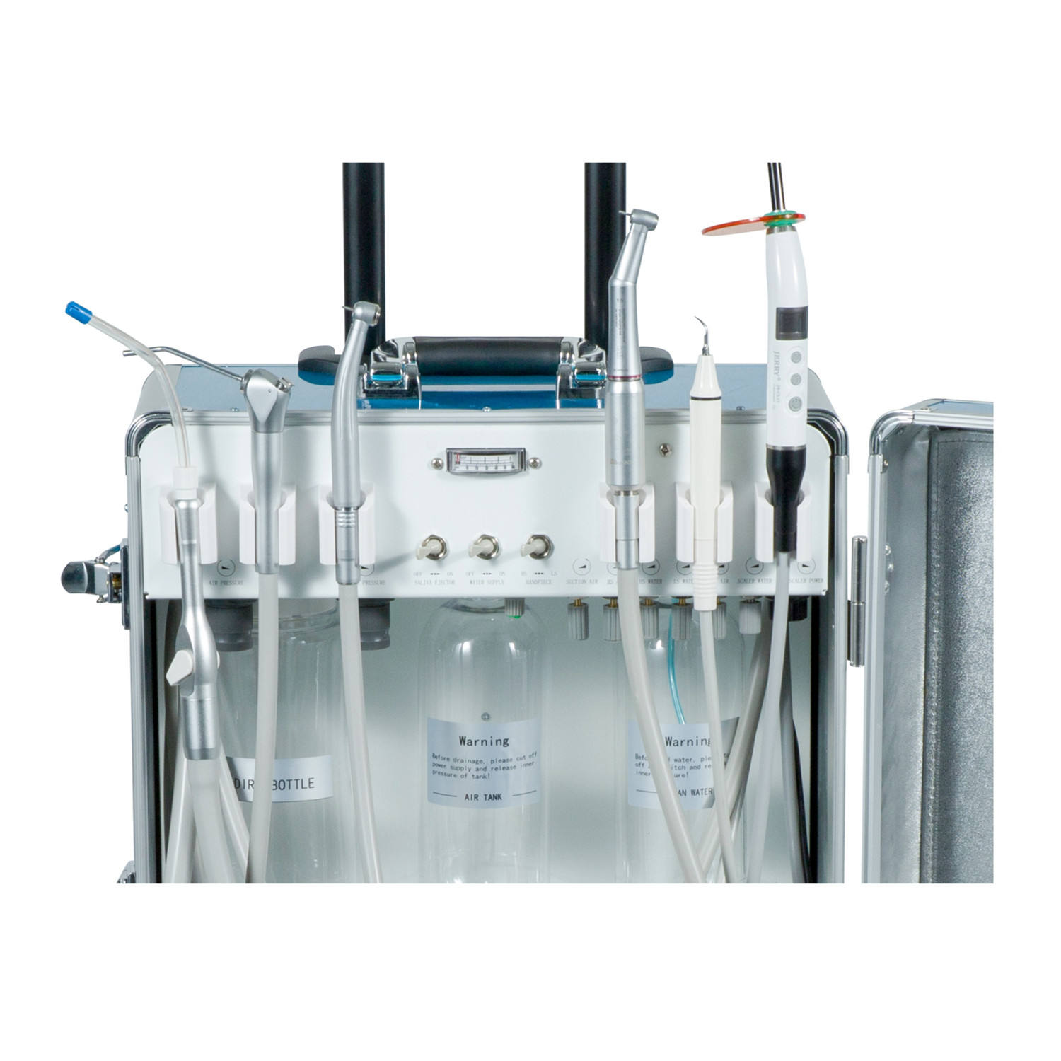 Multi-functional dental unit in small size and portable design, contains same functions as traditional dental chair, and with built-in oil free compressor. It is qualified with a fashionable appearance, aluminum alloy case or ABS case as option, light in weight but durable in quality. All instruments are packed in a small case, with space for storage. It is convenient to carry out for outdoor dental treatment.