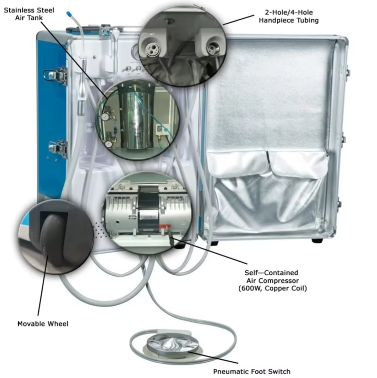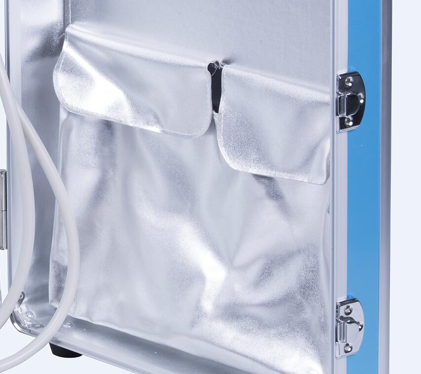 Multi-functional dental unit in small size and portable design, contains same functions as traditional dental chair, and with built-in oil free compressor. It is qualified with a fashionable appearance, aluminum alloy case or ABS case as option, light in weight but durable in quality. All instruments are packed in a small case, with space for storage. It is convenient to carry out for outdoor dental treatment.