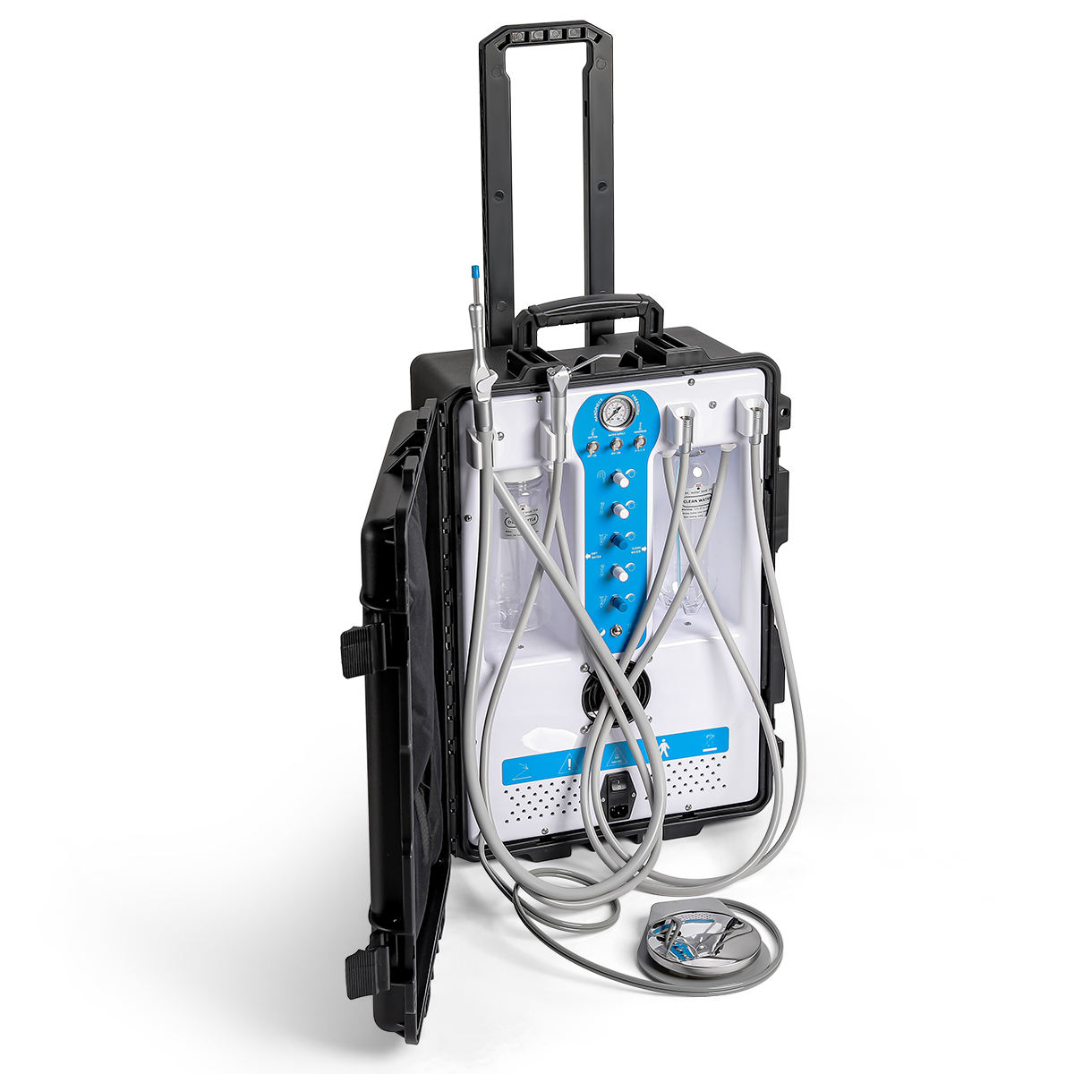 Multi-functional dental unit in small size and portable design, contains same functions as traditional dental chair, and with built-in oil free compressor. It is qualified with a fashionable appearance, aluminum alloy case or ABS case as option, light in weight but durable in quality. All instruments are packed in a small case, with space for storage. It is convenient to carry out for outdoor dental treatment.