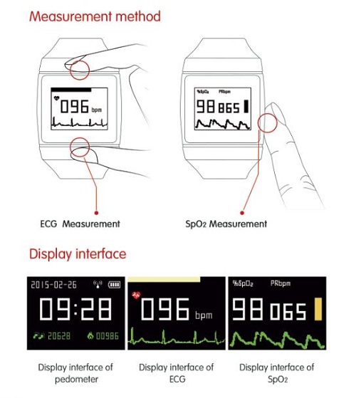 2. Display of SpO2 value, pulse rate value, heart rate value, ECG waveform, step number and calories.